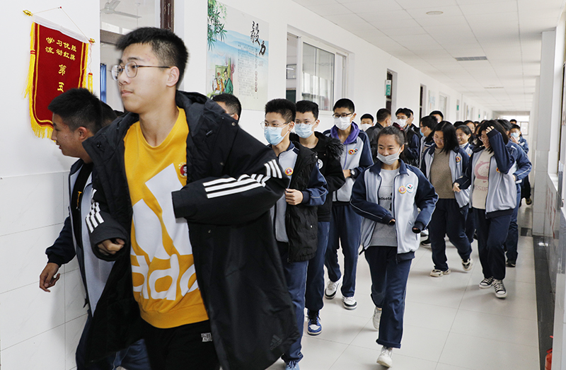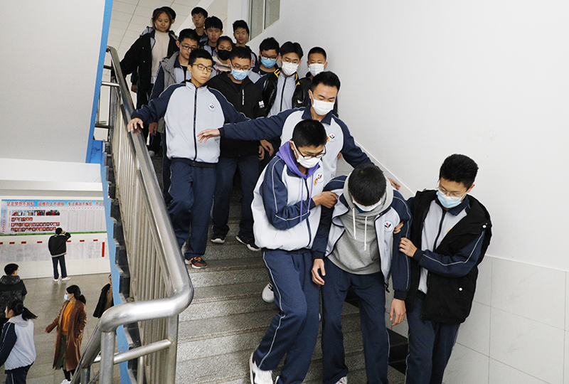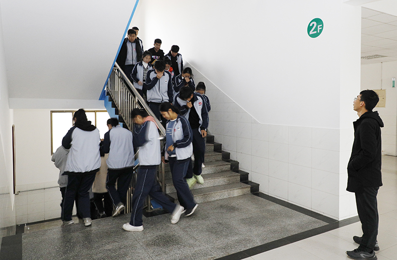演练前,学校召开调度会对演练各个环节进行了周密安排和部署。9时整,警报响起,任课教师立即指挥学生紧急疏散,教师打开前门,同时命令后排靠门的同学打开后门,然后指挥学生按指定路线进行有序疏散。各班疏散到集合地点后,班主任清查班级人数并向级部主任汇总。演练中,学生们还模拟了在疏散时发生了意外及正确的处置方法。