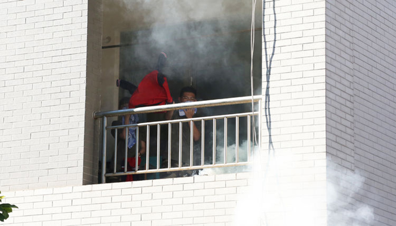 演练开始,下午3点35分,安保处主任徐金光接到男生公寓1号楼楼管员李龙岗电话,“1号宿舍楼213房间发生火灾,现场浓烟滚滚,原因不明!”该楼内共有605名师生,现213宿舍有2名学生被困阳台。当徐金光主任快速赶到现场时,这2名学生正手拿红色衣物摇晃,示意所在位置。徐金光向被困学生喊话,“关好阳台门窗,用湿毛巾捂住鼻子,等待救援!”安抚好学生情绪后,他同时迅速通知应急救援指挥小组,启动火灾应急救援预案。