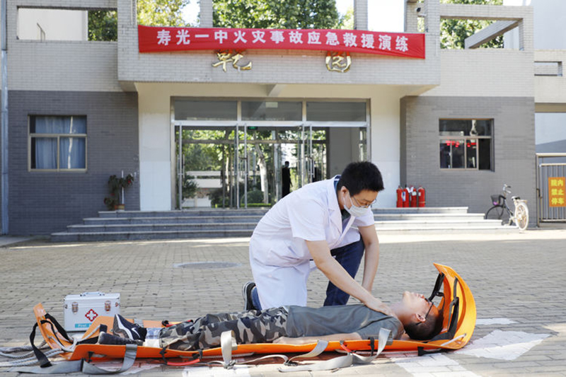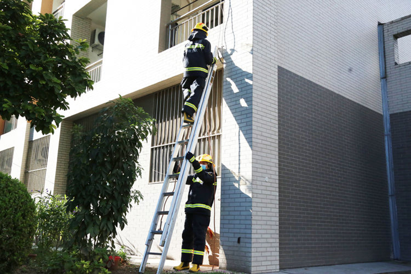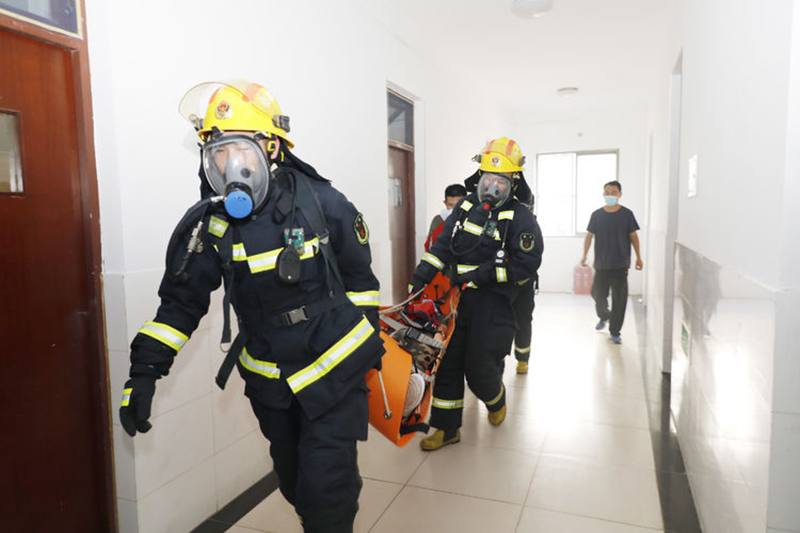 此时,宿舍楼内的其他同学,在各班班主任的组织下,用湿毛巾捂住口鼻,迅速沿着消防逃生路线俯身撤离。市消防救援大队到达现场后,立即组织救援和“灭火”。救援组两名消防员搭好云梯,开始“营救”被困在2楼阳台上的两名学生,在得知1名学生晕倒后,消防员穿过浓烟,用担架将昏迷学生抬到安全空旷处,医务人员立即查看学生“伤情”并对其进行心肺复苏。灭火组消防员铺设好水带,迅速开始扑灭“明火”。