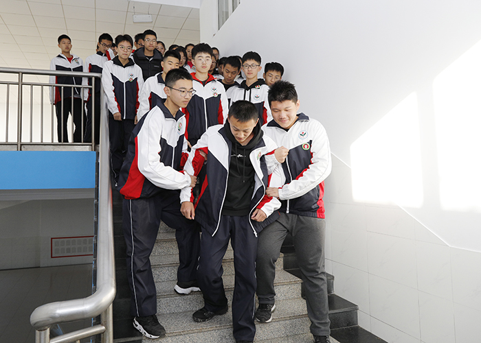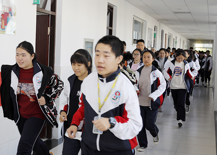 9点10分,警报响起,任课教师迅速组织学生进行紧急疏散,教师打开前门,同时命令后门旁的学生打开后门,指挥学生按指定路线进行有序疏散。学生们到达集合地点后,班主任清查班级人数并向级部主任汇总,级部主任对各班的疏散活动进行了点评。演练中,学生们还模拟“学生摔倒”的意外情况,学生们按照预先学习的保护应急措施迅速“处理”了“意外事故”。