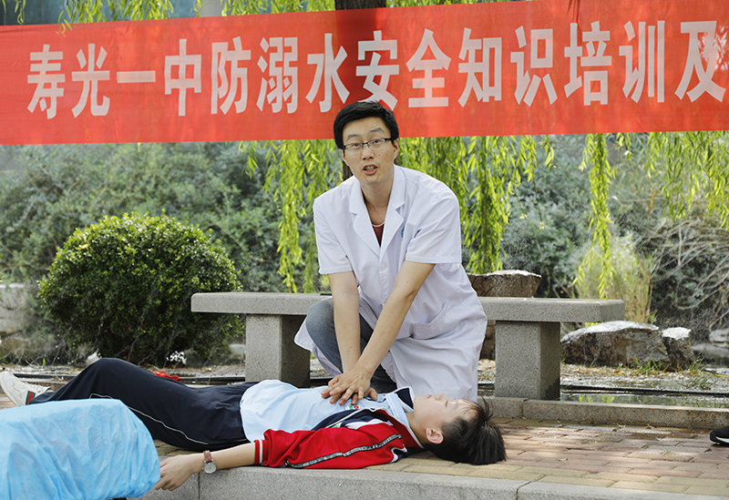 在演练环节,校医务人员张中华通过实际动手操作的方式,向师生传授了在他人溺水昏迷后应该如何进行心肺复苏急救,以及在进行心肺复苏急救时应该注意哪些要点。