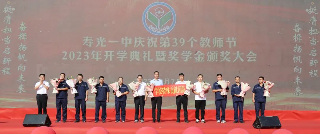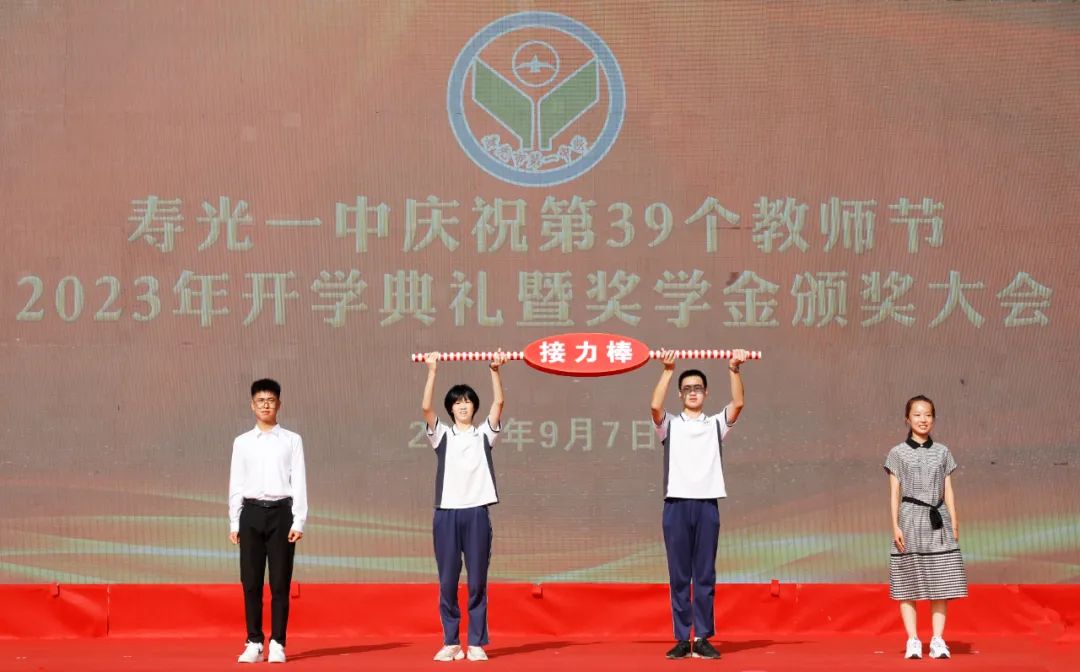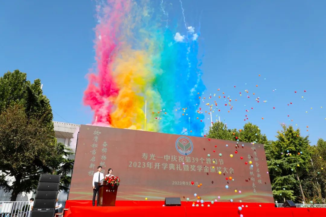 百川赴海,一叶报秋,朝气葱茏的寿光一中迎来新气象。9月7日上午,寿光一中庆祝第39个教师节2023年开学典礼暨奖学金颁奖大会隆重举行。奖学金代表天成集团副总裁禹国柱先生,文汉奖学金代理人黄效德先生,学生家长栾燕女士,寿光一中党委书记、校长肖学军,学校领导班子全体成员以及全校师生出席活动。典礼网络直播同步进行。