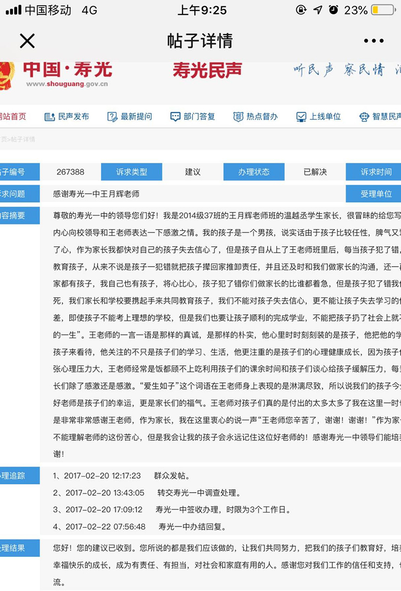 用爱沟通,助力学生成长。教育无小事,事事是教育,王老师注重教育的艺术,用沟通走进学生和家长的心里。多年的用心和用情沟通,使他获得了众多家长的真心称赞与尊敬。在育人探索的路上,王老师说,他将永不止步。他是当之无愧的奉献者。
