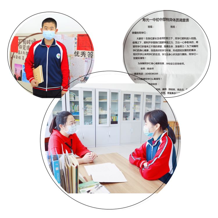 “为保障同学们的身心健康,创造良好的学习环境,现对开学以来同学们的生活、学习及身心状况进行摸排。”摊开这张细致的特异体质调查表,我们感受到初中部老师们的用心。学生是否属于过敏等特异体质,学生的睡眠质量如何,学生面对中考的压力大小,是否能够参加活动量较大的体育锻炼等等,一张调查问卷,写满“无微不至”。