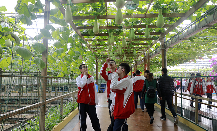 本次远足研学活动以“畅享春景 放飞梦想”为主题,由党政办、教育处和高一年级统筹安排,分批参观。副校长李耀华对活动作了安排和要求,提出环保倡议。在菜博会九号展厅,郭魁元老师带领同学们参观了观赏性和实用性有机联系的蔬菜文化艺术景点,并结合理论知识进行深入讲解。随后,同学们自由参观了各个展厅,看着琳琅满目的稀特蔬菜和美仑美奂的蔬菜景观,同学们赞叹不已,对家乡的自豪感油然而生。参观完菜博会,同学们又来到寿光历史文化中心和寿光植物园,了解“三圣”文化,感受大自然的魅力。