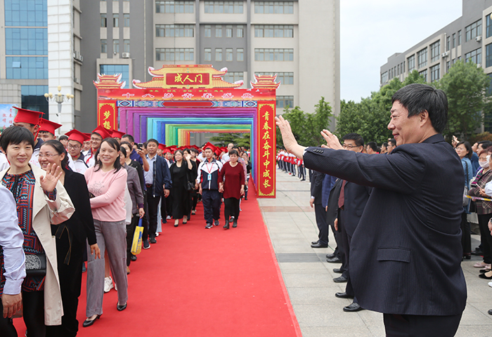 求真广场上,一座长20米、由18道彩门组合而成的成人门矗立其中,高大壮观,鲜红的地毯贯穿其中,主席台上“奋斗、青春、感恩、责任”几个大字分外醒目,浓浓的仪式感让这个特殊时刻显得格外隆重。
