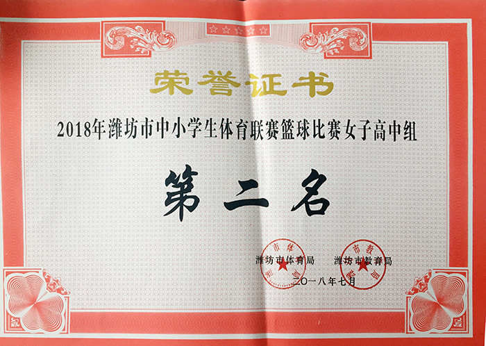 近日,2018年潍坊市中小学生体育联赛篮球比赛圆满结束,我校女子篮球队取得潍坊市高中女子组第二名的好成绩,学校荣获“潍坊市体育联赛先进单位”称号,同时我校女子篮球队将代表潍坊市参加山东省中小学生篮球联赛。