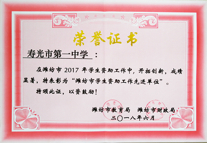 近日,我校被潍坊市教育局和潍坊市财政局联合授予“潍坊市学生资助工作先进单位”荣誉称号。