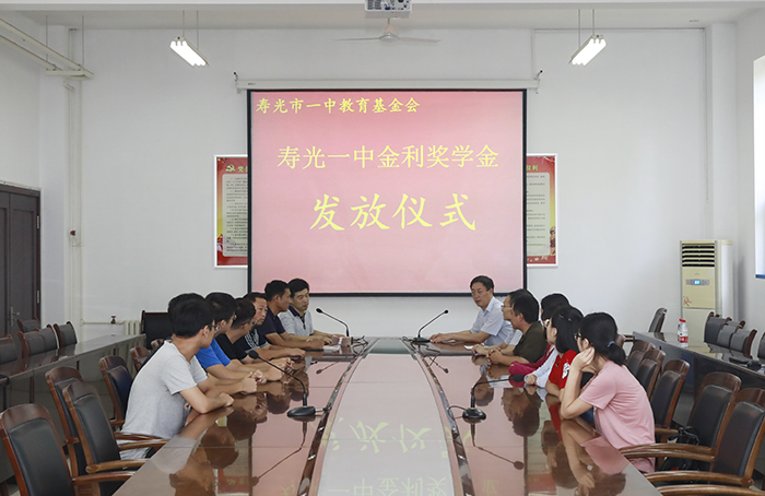 8月22日上午,我校在第一会议室举行了寿光市一中教育基金会金利奖学金发放仪式。潍坊市同信保温工程有限公司董事长孙金利先生来我校发放奖学金,市委统战部副部长、市工商联党组书记、常务副主席朱天森,市工商联秘书长孟庆正,市工商联主任房德绍,我校党委书记、校长王继林,副校长李东洲、梁本江参加活动,李东洲副校长主持。
