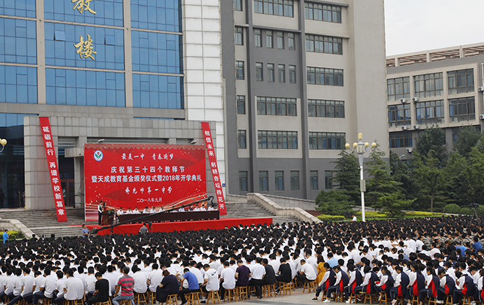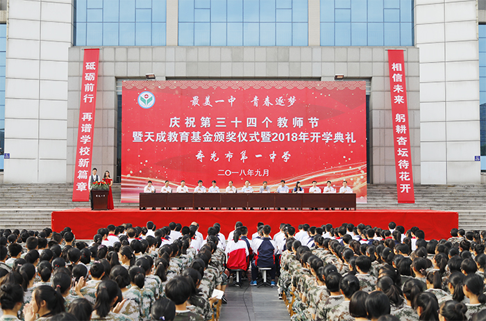寿光市委常委、副市长张振城,市教育局领导朱导泉,天成集团总裁郭百礼,文汉奖学金代表黄效德,家长代表袁淑娟,学校领导班子全体成员以及全校师生共计8000余人参加典礼。典礼是对教师们节日的祝福,是对天成教育基金成立的感恩,是对2600余名新学子加入寿光一中的欢迎,更是对全校师生新学年砥砺前行的号召。