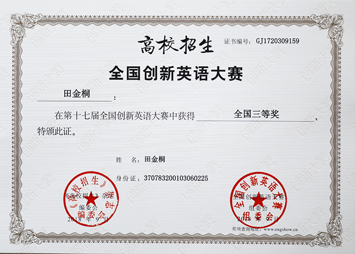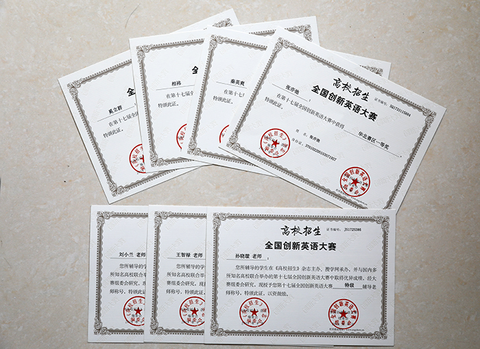 近日,在第十七届全国创新英语大赛中,我校选手凭借扎实的英语功底和出色的赛场表现,获得了大赛评审专家组的高度肯定,取得了优异成绩。