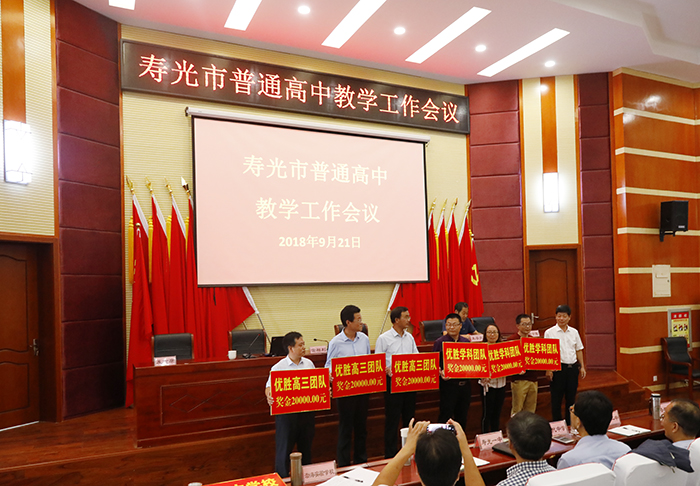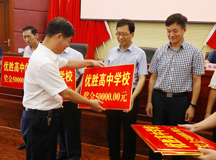 李玉明局长为2018年优胜高中学校、优胜高三团队和名生特别奖颁奖,我校魏华中校长、梁本江副校长和刘全海主任上台领奖。
