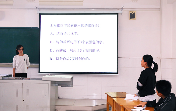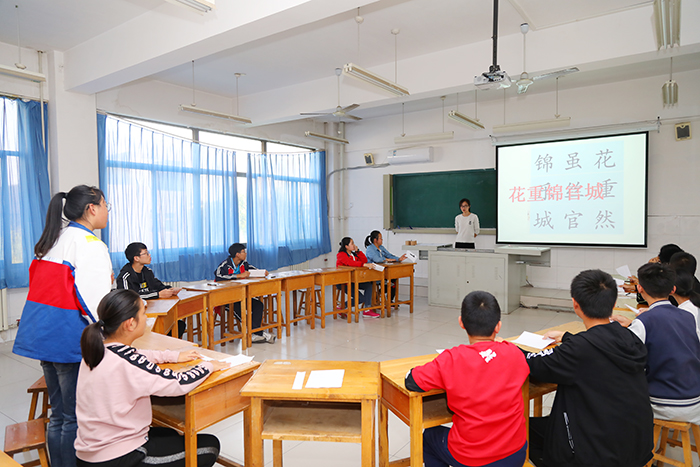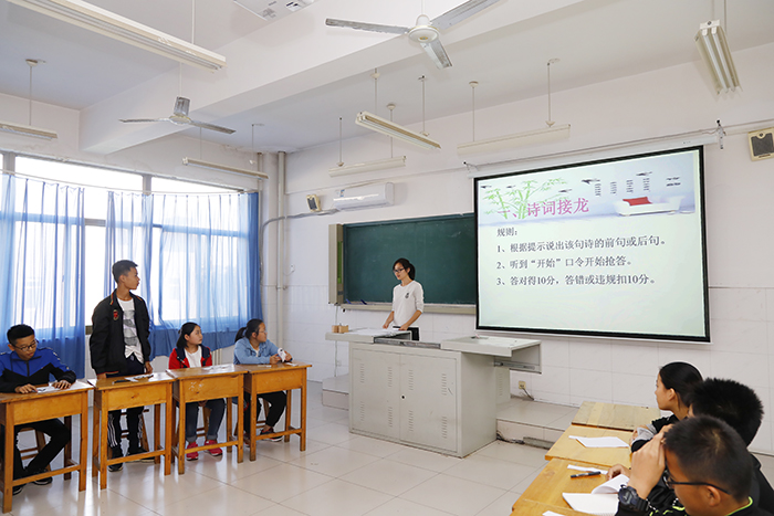 活动分为诗词接龙、九宫格、十二宫格、图片线索题、文字线索题、飞花令六个环节,通过必答、接龙、抢答、对抗等方式进行淘汰。19位选手经过激烈的角逐,孙闻笛,王艺蒙,张昕瑶等同学赢得八强席位,最终将在他们中间产生四强代表我校初中部参加全市诗词大赛。