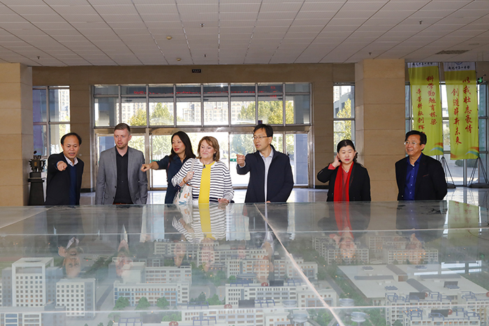 魏华中校长陪同Di Roberts女士一行参观了校园,并进行合影留念。在学校沙盘前,魏校长向来访客人介绍了学校的规划布局、功能划分、办学规模等情况。随后的座谈中,魏华中校长与Di Roberts女士互换了礼物,以示两校友谊长存。魏校长介绍了我校的办学理念、办学特色以及国际交流等情况。Di Roberts女士就布洛赫特公立中学概况、留学要求及课程设置等进行说明。双方希望今后能在师生交流、学术研讨等方面开展进一步的合作与交流,促进共同发展。