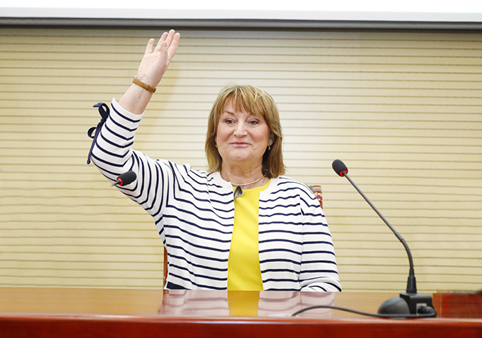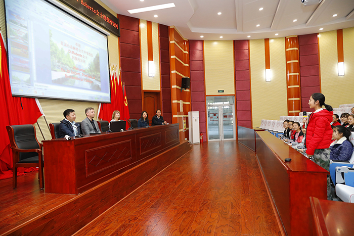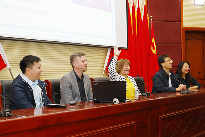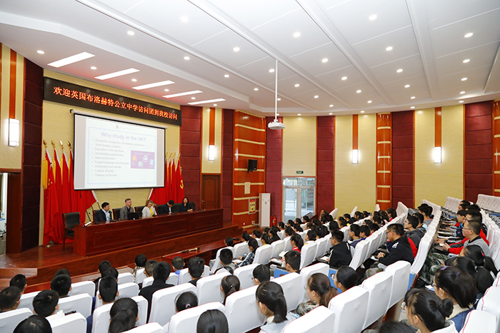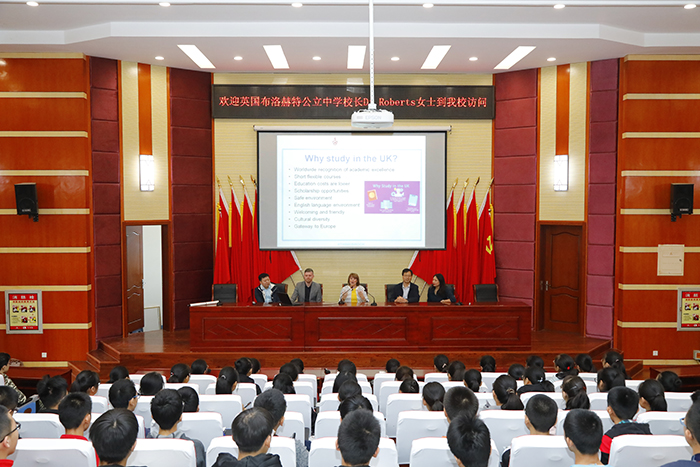 最后,Di Roberts女士一行来到四号教学楼报告厅,与同学们面对面交流。Di Roberts女士对布洛赫特公立中学进行了详细的介绍,同学们就留学中关切的问题向Di Roberts女士提问,并得到了全面的解答。同学们在轻松愉悦的氛围中增长了见识,拓宽了视野,Di Roberts女士对我校学生的英语水平给予了很高的评价。