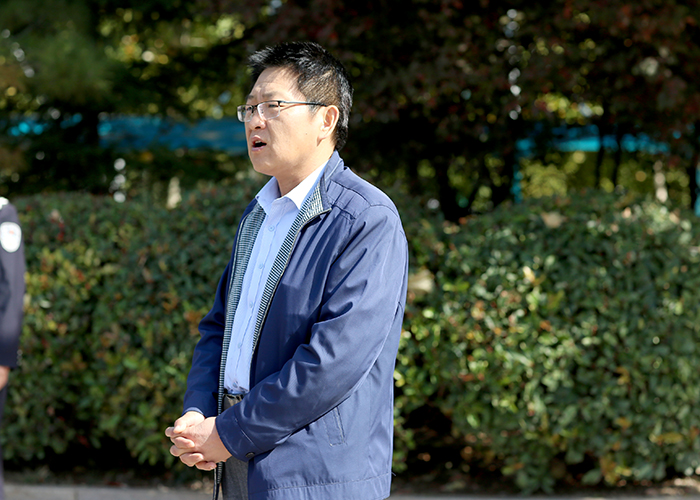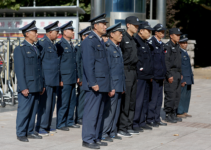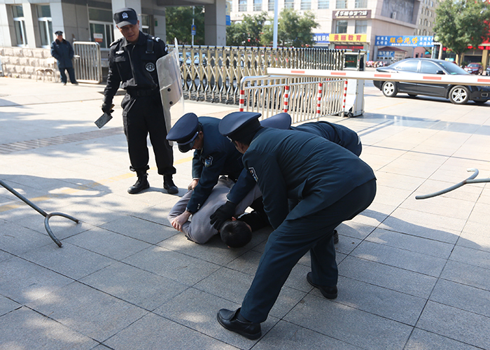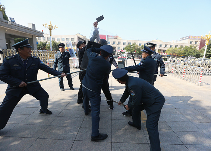 演练前,教育处张志胜主任对安保人员工作纪律做了明确要求,安保科徐金光主任对保安进行了警械使用培训。演练开始,一名“歹徒”持刀闯入校园,安保人员立即用警卫器械进行阻拦,夺下“歹徒”手上的凶器,并上报学校和拨打报警电话,将“歹徒”制服。