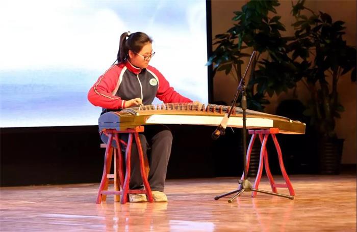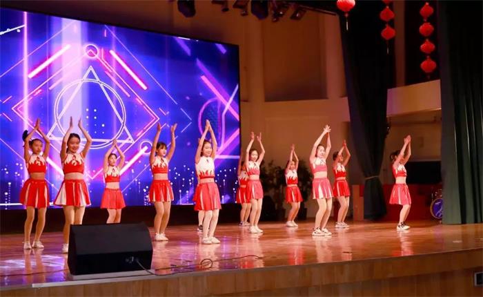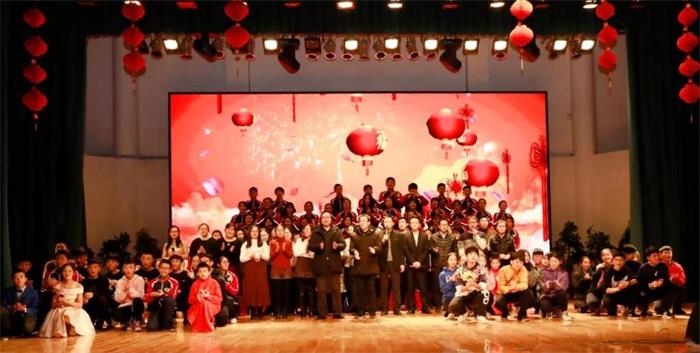 初中部教师和家长代表也通过视频向大家致以新年的祝福。汇演现场,既有舞蹈、歌曲节目,还有乐器演奏、朗诵等节目,让人们看到了孩子们的多才多艺。此次文艺汇演有个突出的特点,学生发扬传统曲艺优势的同时创新娱乐方式,奏出了和谐曲。《姥说》,两个孩子用相声形式,有趣地表达了姥姥的“爱意”,让人不禁回味起亲情的味道。初中部还展示了学生社团建设成果,《舞蹈串烧》、《EIEI》、独舞《九儿》、合唱《年少的味道》等社团选送节目很受欢迎。师生合唱《相亲相爱一家人》,现场气氛随醇厚的歌声而愈加浓烈,大家随着节拍一起摆手,文艺汇演到达高潮。