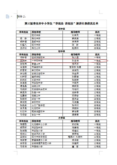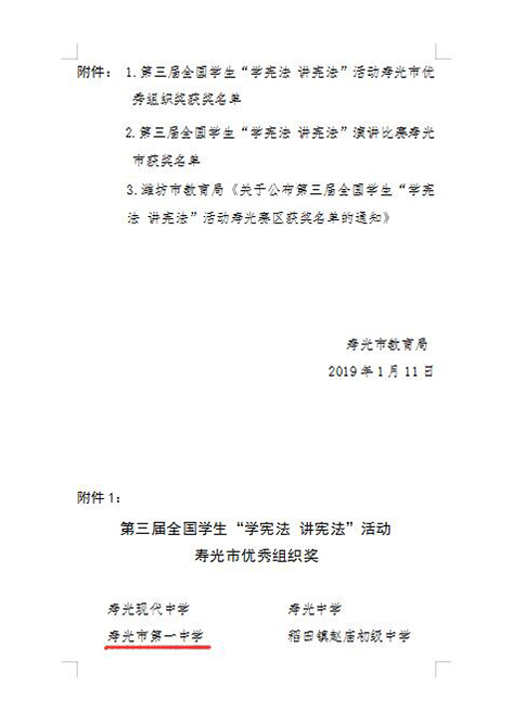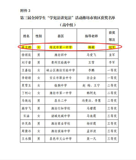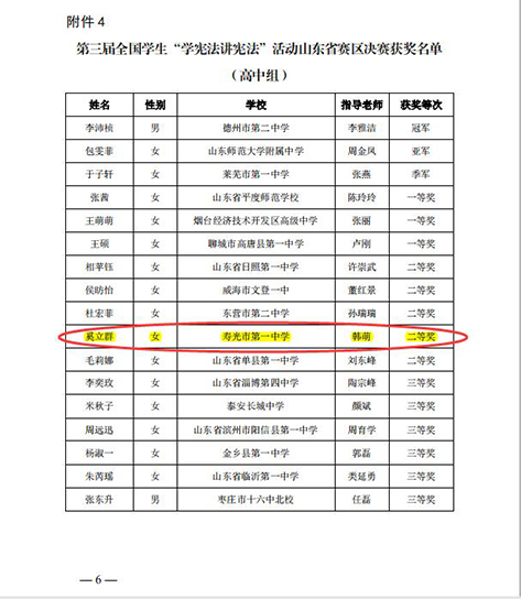 奚立群同学(指导老师韩萌)获山东省赛区决赛二等奖,获潍坊市赛区冠军;初中部王跃轩同学(指导老师孙玉倩)获寿光市中小学生“学宪法讲宪法”演讲比赛初中组一等奖;我校荣获寿光市优秀组织奖。
