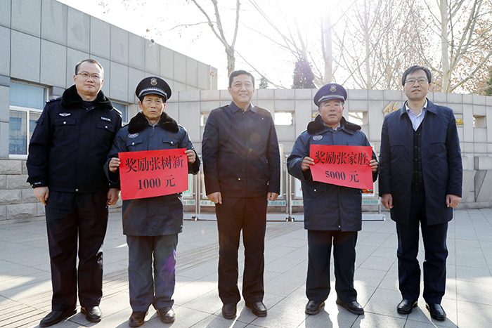 刘建东副市长为张家胜和张树新两位尽职尽责、兢兢业业的优秀保安代表送上了慰问奖励金。在听取了魏华中校长关于学校安全的工作汇报后,刘建东副市长肯定了学校的安保工作,并对学校今后安全工作提出了建设性指导意见。