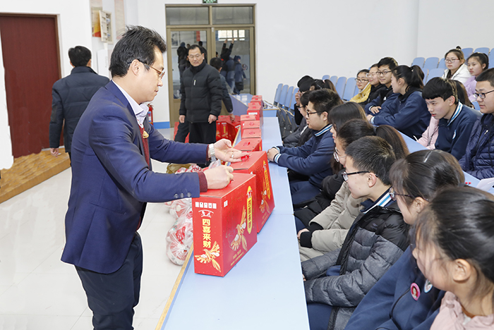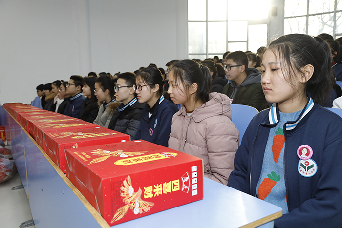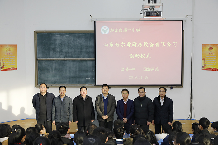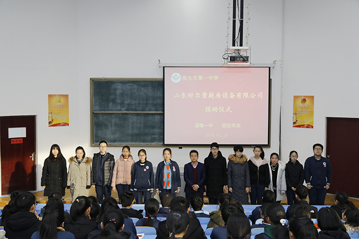1月28日,我校举行了山东好尔贵厨房设备有限公司捐助仪式,公司总经理张庆斌向我校2018级家庭贫困且品学兼优的100名学生捐赠了一批大米、油等新年物资。市教育局教科研中心副主任肖学军、学校包级校长张玉富、学校工会主任李万波出席活动。