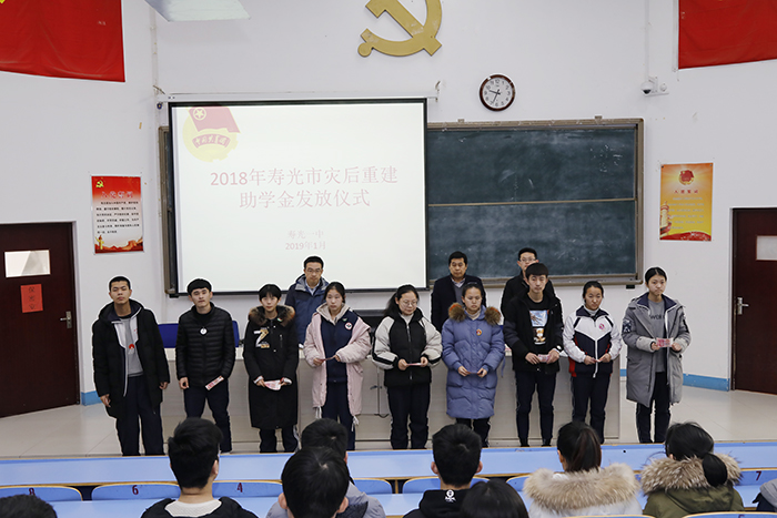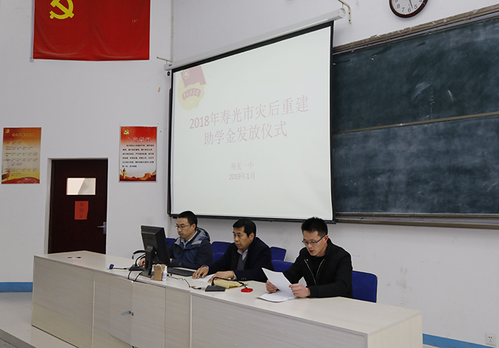1月28日,我校在3号教学楼报告厅举行2018年寿光灾后重建助学金发放仪式,团委书记范成吉主持活动。