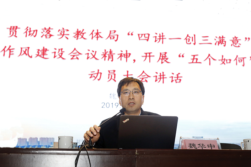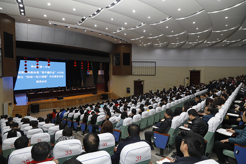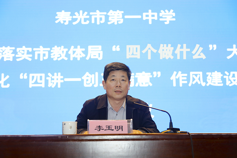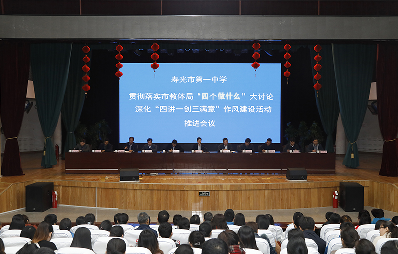 3月29日下午,我校召开贯彻落实市教体局“四个做什么”大讨论活动暨深化“四讲一创三满意”作风建设活动动员大会,动员全校教职员工迅速统一思想,以问题为导向,狠抓整改,全力做好“五个如何”,推动干部教师思想大解放,作风大转变,效率大提升。市教体局党组书记、局长李玉明出席会议并讲话。我校全体教职员工参加会议,?学校党委委员张丰辉主持会议。