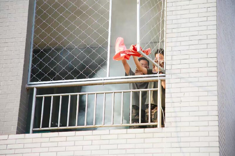 演练开始,下午4点05分,安全保卫处主任徐金光接到男生公寓1号楼楼管员刘效治电话,“1号宿舍楼213房间发生火灾,现场浓烟滚滚,原因不明!”该楼内共有590名师生,现213宿舍有2名学生被困宿舍。当徐金光主任快速赶到现场时,这2名学生正在阳台手拿红色物品摇晃,示意所在位置。徐金光向被困学生喊话,“关好阳台门窗,用湿毛巾捂住口鼻,等待救援!”安抚好学生情绪后,他同时迅速通知应急救援指挥小组,启动火灾应急救援预案。