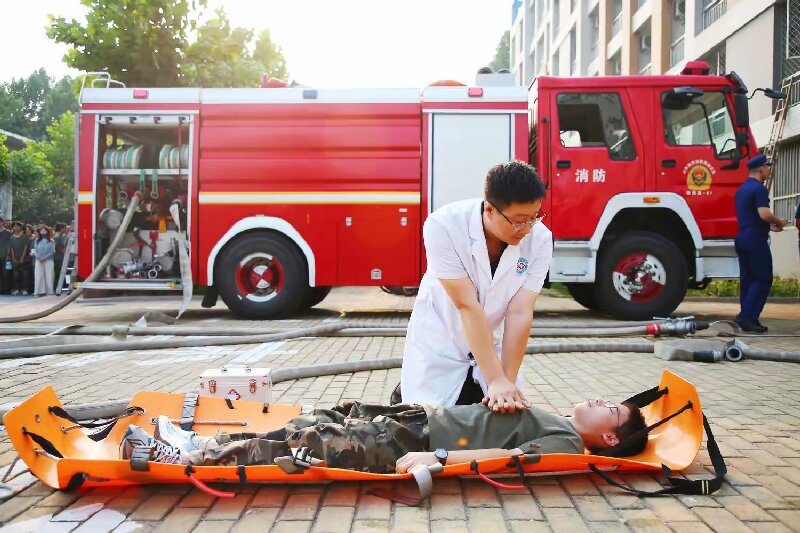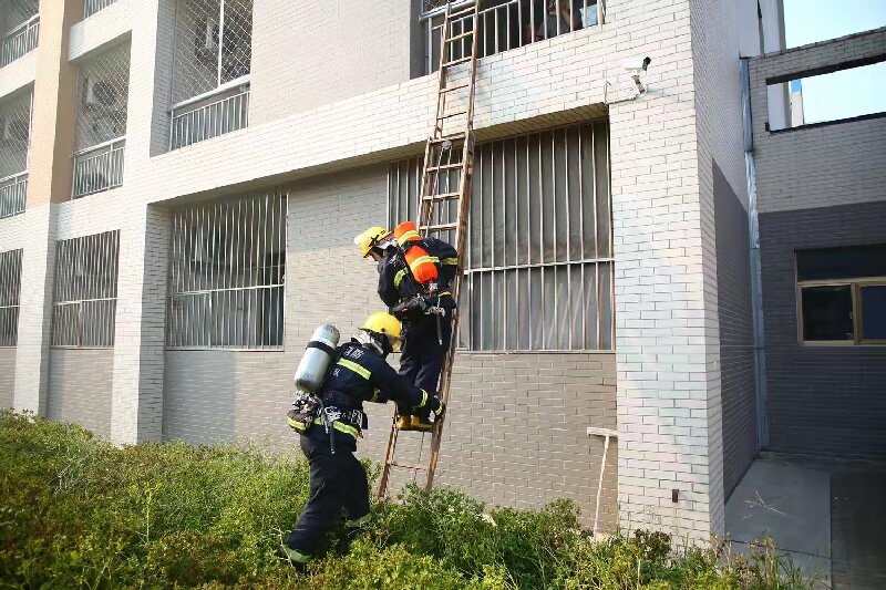 救援组两名消防员搭好云梯,开始“营救”被困在2楼阳台上的两名学生,在得知1名学生晕倒后,消防员穿过浓烟,用担架将昏迷学生抬到安全空旷处,医务人员立即查看学生“伤情”并对其进行心肺复苏。灭火组消防员铺设好水带,迅速开始扑灭“明火”。