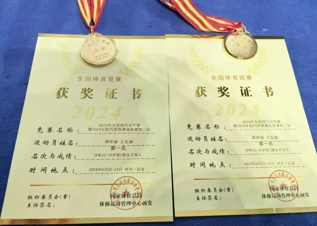 一种拼搏、一份坚持、一份成长。本次比赛共设置了成年、青年、少年等6个组别、10个难度级别,分为女子双人、男子双人、混合双人、女子三人、男子四人、大集体等项目。比赛共吸引来自全国各省、自治区、直辖市、各业余体校、俱乐部的123支代表队近千余名教练员、裁判员、技巧精英们参赛。历经重重考验,我校王宜涵获少年组2级女子双人第一名,李冠希获青年组2级男子四人第二名,杨明霄获少年组2级混双第三名,杨明轩获少年组2级混双第五名,刘存铉获少年组2级混双第八名,高嘉辰获青年组2级混双第八名的优异成绩。