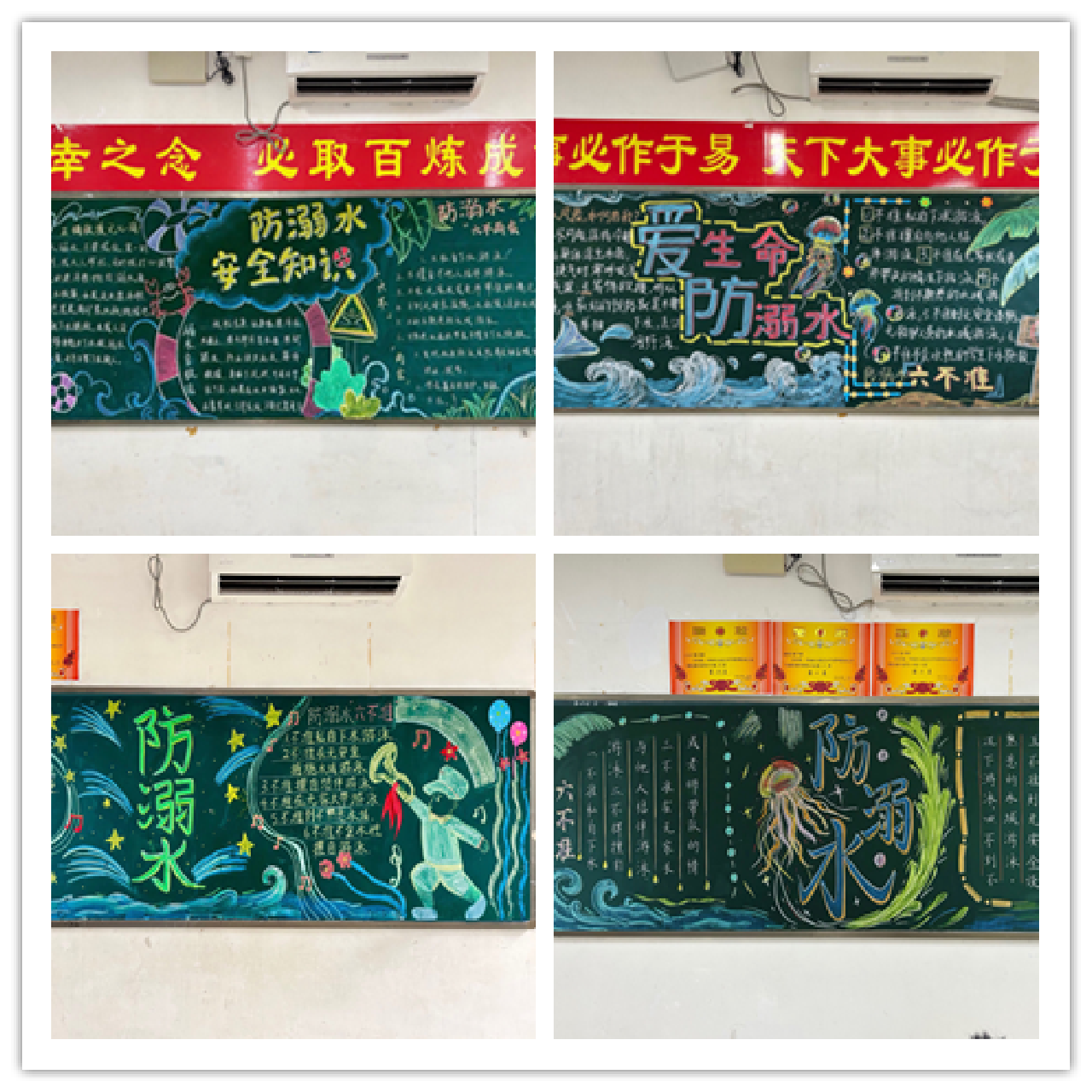 以宣促学。学校利用国旗下的讲话、主题班会、黑板报评比、观看《防溺水安全警示片》等活动对全校学生进行防溺水安全教育。校园电子屏每天滚动播出防溺水警示标语,宣传栏张贴防溺水宣传画,同时通过家长群、微信公众号定期向学生、家长普及防溺水安全知识,以潜移默化、润物无声的形式,全方位加强学生防溺水安全教育。