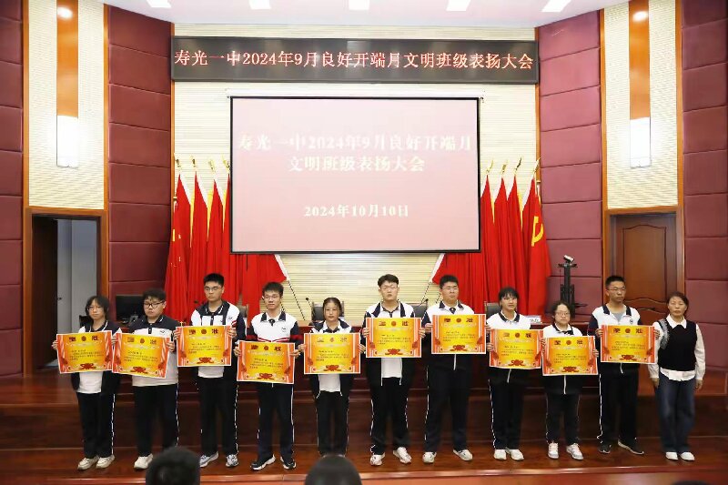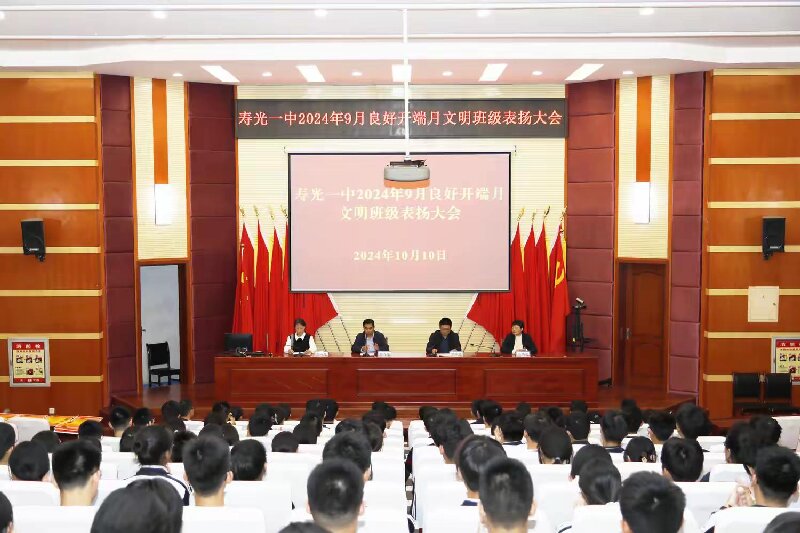 良好开端月,奋战新学期。10月10日晚,寿光一中良好开端月文明班级表扬大会在学校四号教学楼报告厅召开。学校校长助理张志胜,学生处副主任张兰芹、马晓玲及各年级学生干部参会。安保处主任徐金光主持会议。