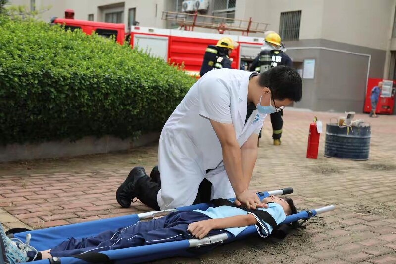救援组消防员迅速架设云梯,对8楼阳台的被困学生实施救援。得知1名学生“晕倒”后,消防员穿越浓烟,用担架将其转移至安全空旷区域,医务人员随即上前检查“伤情”并开展心肺复苏操作。灭火组同步行动,快速铺设水带,对“明火”进行扑灭。
