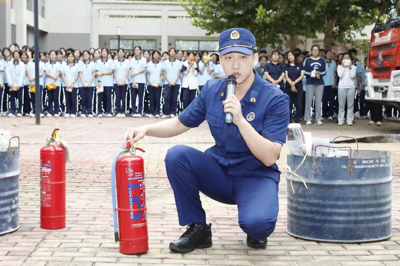救援环节结束后,全体参演师生集中列队,观看消防队员演示灭火器使用方法,并逐一实践操作、接受专业指导。校长助理张志胜对演练全程进行总结,点明存在的问题并提出改进要求。此次演练组织有序、场景逼真,最终圆满落幕。