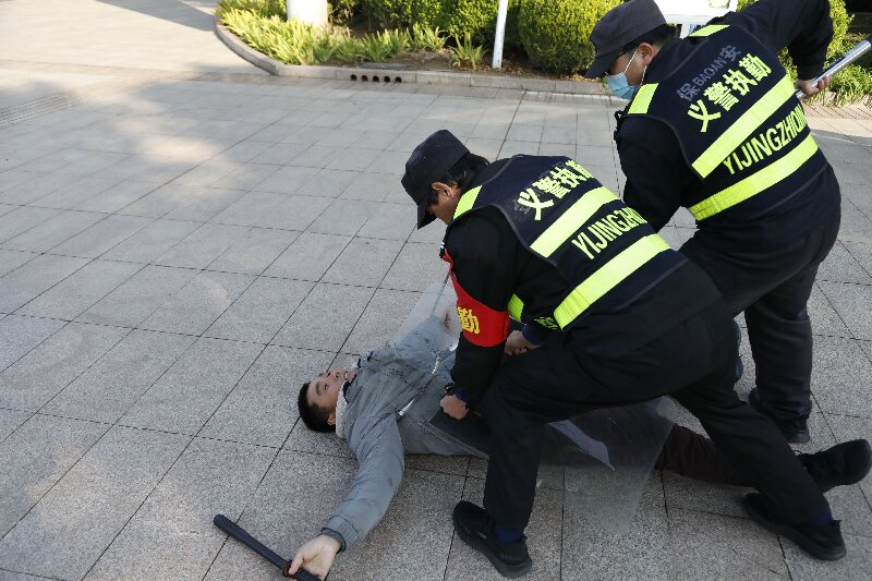 突击防暴演练正式开始,一名“歹徒”手持“凶器”意图持械闯进学校行凶,被校门口执勤保安及时发现。
