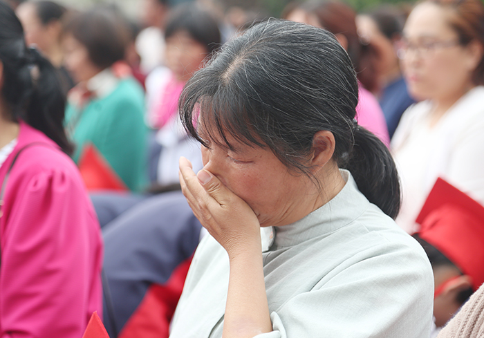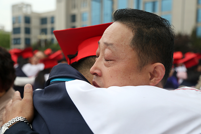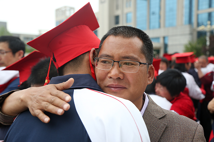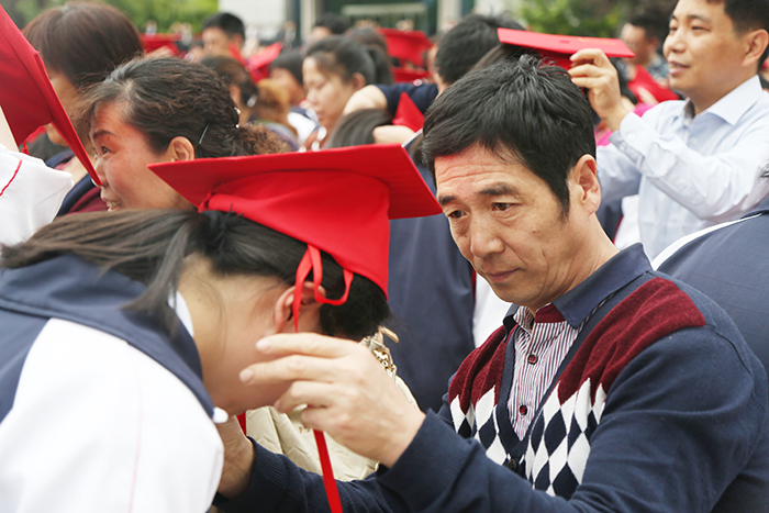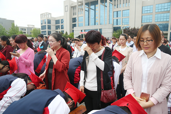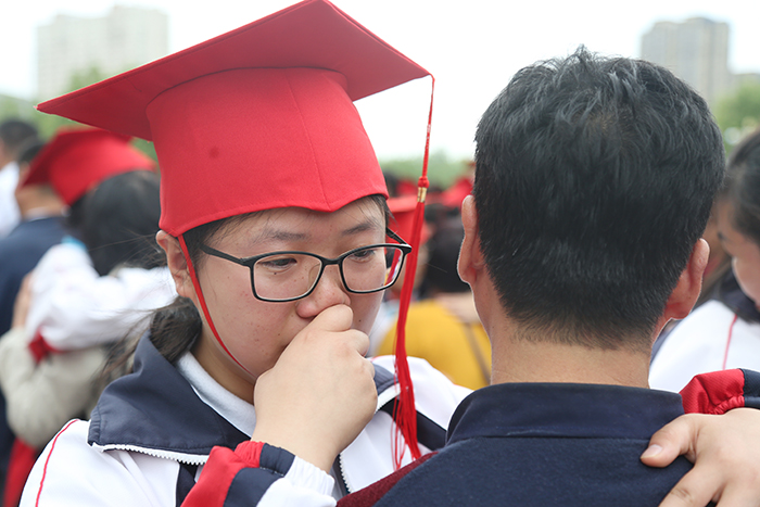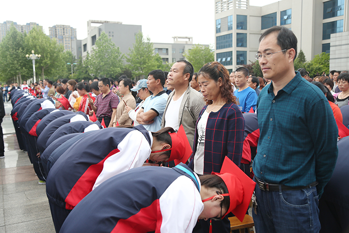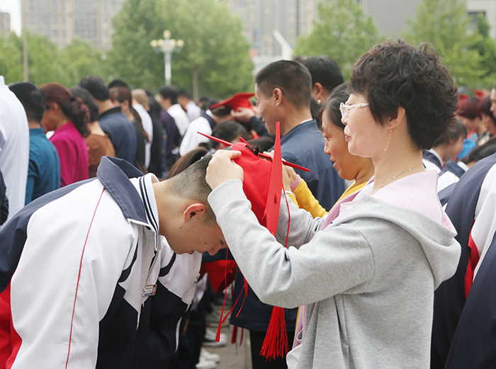 在庄严的升国旗仪式后,学校为同学们举行了隆重而感人的冠礼仪式。十八年来默默陪伴孩子成长的父母亲手为孩子冠带成人帽,见证他们成人的庄严一刻。学生对父母三鞠躬,感谢父母18年来含辛茹苦地养育。在这暖流交汇的时刻,孩子们与父母深情拥抱在一起,用真情拥抱表达对父母18年来无私付出的感谢、感恩!并大胆对父母道一声“爸、妈,我爱你!”此时此刻,许多父母热泪盈眶、为之动容,场面温馨而感人,他们真切地感受到孩子们长大了,懂事了。