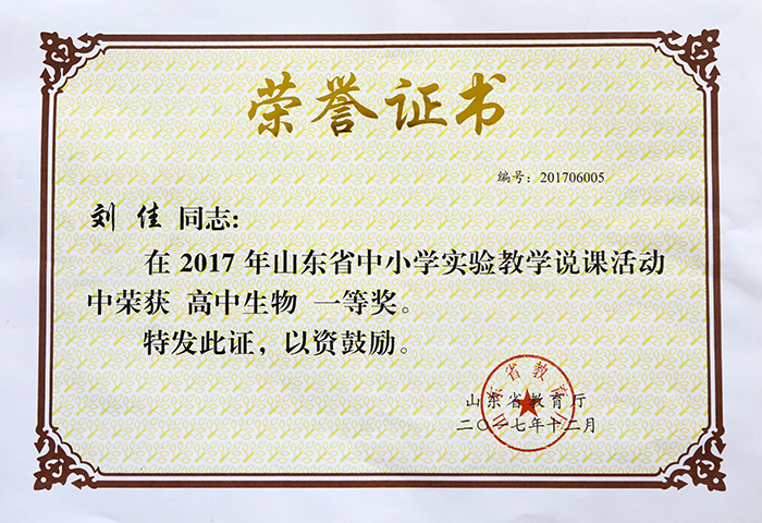近日,2017年山东省中小学实验教学说课活动在烟台市圆满落下帷幕。参赛教师围绕实验教学目标、内容设计、方法设计、过程设计、教学反思和自我评价等内容,进行10分钟的说课展示,由专家现场评审。我校刘佳老师脱颖而出,荣获高中生物组一等奖,是我市唯一获此殊荣的高中教师。