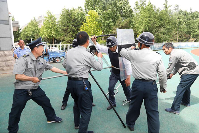 器材使用方法介绍完毕后,徐金光科长带领安保人员就模拟处置不法分子冲撞校园事件进行分组演练,参训人员在演练中认真学习安保器材的使用技巧,并反复演练各动作要领。