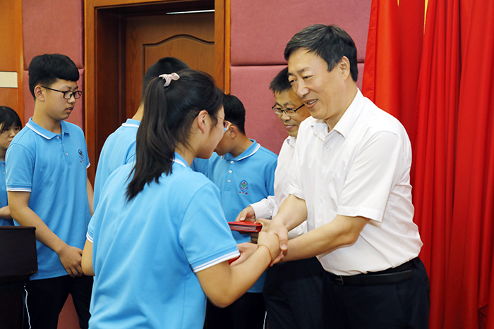 14点40分,诗朗诵《在这离别之际》,同学们用诗意的语言诉说了过往的点点滴滴,憧憬着未来,成长的路上离不开母校、老师和父母的呵护,感谢路上有你一直陪伴。14点50分,初三全体老师接受了学生们的爱意。同学们向老师献花并拥抱他们。一年的酸甜苦辣在此刻交融,包含了千言万语。 15点整,王继林校长和杨正乐副校长为初三全体同学颁发毕业证书。同学们从校长手中郑重地接过毕业证书,享受胜利的喜悦、体味丰收的甘甜。