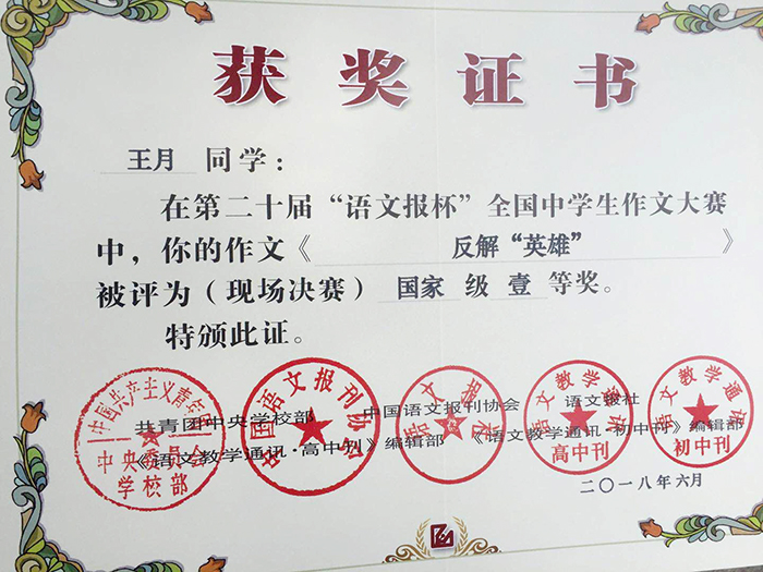 2017级43班吴家琳同学凭借《诚与诚》一文荣获“国家级特等奖”,41班王月同学凭借《“反解”英雄》一文荣获“国家级一等奖”,39班奚立群、36班张梦梅同学荣获“国家级二等奖”;学校荣获“作文教学先进单位”荣誉称号。本次大赛,除现场比赛外,还安排了紧张充实的培训活动,大赛结束后,北京大学高远东教授、语文报社社长蔡智敏先生分别对此次大赛进行了点评。