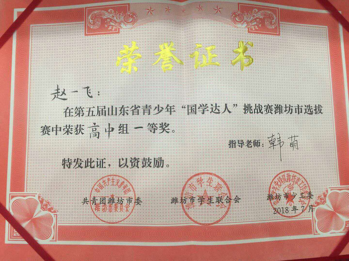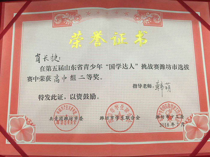 为弘扬社会主义核心价值观,引导激励青少年传承和弘扬中华优秀传统文化,7月12日,第五届山东省青少年“国学达人”挑战赛潍坊市选拔赛成功举行。我校学生赵一飞、肖长捷代表寿光赛区参赛,经过激烈角逐,从150多个参赛者中脱颖而出,赵一飞获高中组“国学达人”挑战赛“状元”称号,将代表潍坊市参加山东省的挑战赛。肖长捷获得了高中组第四名。