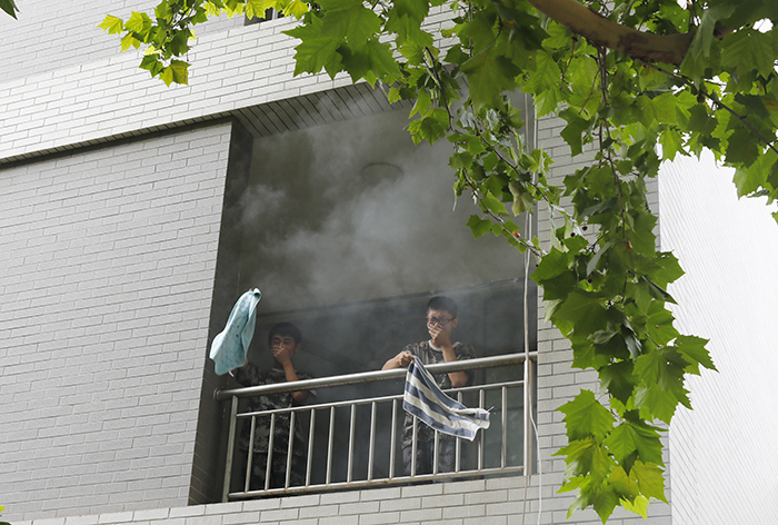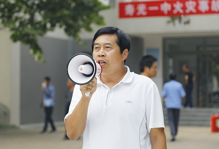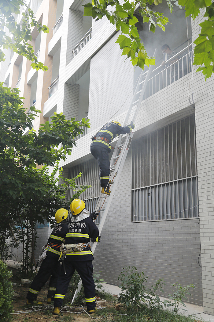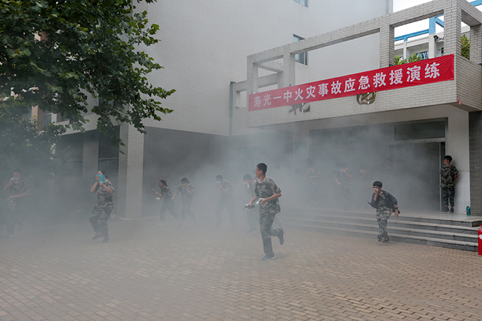 “火灾”公寓楼内的同学们用毛巾掩护口鼻,在各班主任的组织下按规定路线附身贴墙有秩序疏散。寿光市消防大队的消防车到达现场“灭火”,同时“营救”被困在2楼阳台上的学生。随后,医务人员现场查看学生“伤情”并对其进行心肺复苏。