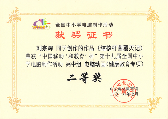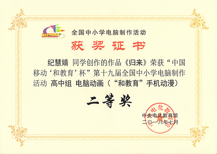 近日,中央电化教育馆传来喜讯,我校学生在“中国移动‘和教杯'”第十九届全国中小学电脑制作活动中取得优异成绩。郭懿晨同学制作的电脑动画(二维)作品《千里马新传》、张亦驰同学制作的计算机程序设计作品《智慧餐盘》获高中组一等奖;季慧婧制作的电脑动画(“和教育”手机动漫)《归来》、刘宗辉设计的电脑动画(健康教育专项)《结核杆菌覆灭记》获高中组二等奖。