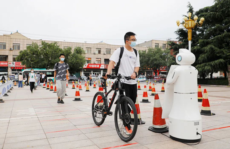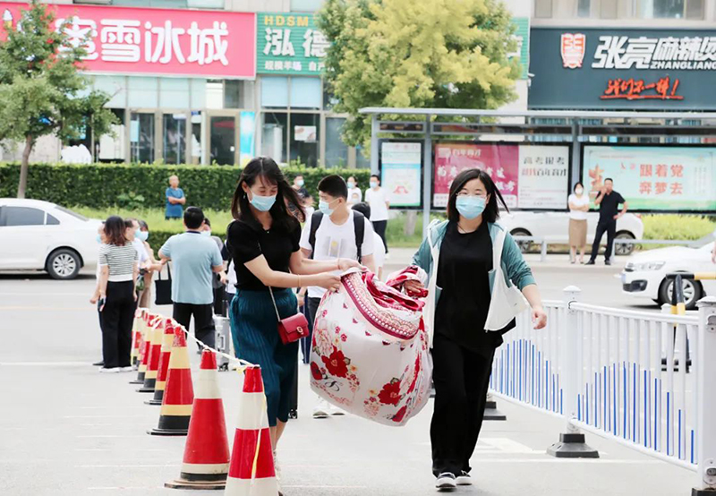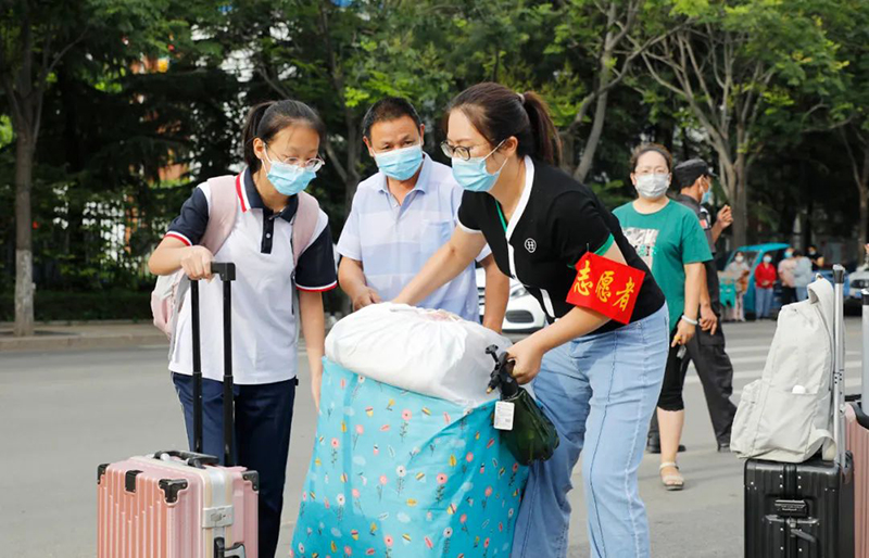 在校区各个入口处,干部教师“志愿者”、机器人“测温大白”、执勤的交警同志,悉心为每一位同学消毒行李、检测体温、疏导交通,保障着大家的生命安全与身体健康。在迎新大道上,热情的“红袖章”细心地引导新生完成入校流程,指引方向的同时不忘帮忙搬运行李,入学更加井然有序、亲切有加。在绿荫笼罩的校园大道上,忙碌的脚步在校园里匆匆穿梭,一辆辆三轮车满载着新生的行李箱驶向教室和宿舍……