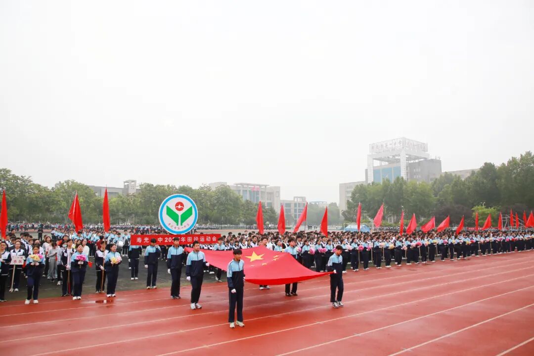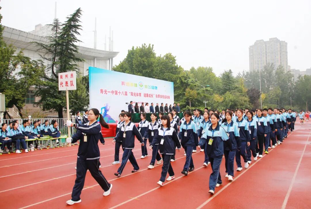 9月28日至29日,寿光一中举行“阳光体育 健康成长”秋季田径运动会。神采飞扬,意气风发,伴随慷慨激昂的旋律,运动会入场式开始。国旗高擎,仪仗生步伐铿锵,护旗入场。在校徽的引领下,鼓乐队紧随其后,花束队队员手捧着象征美好和团结的花束,彩旗队队员高举着鲜红的旗帜,昂首阔步,精神饱满。随后,裁判员代表队、教职工代表队、校园体育社团方队及各个班级运动员代表队依次入场,他们英姿飒爽、蓄势待发,他们精神饱满、自信张扬,他们意气风发、锐不可挡,他们展现出一中人最美的模样。