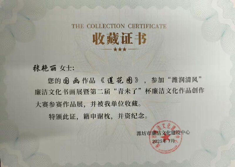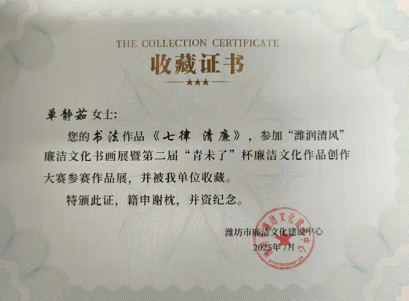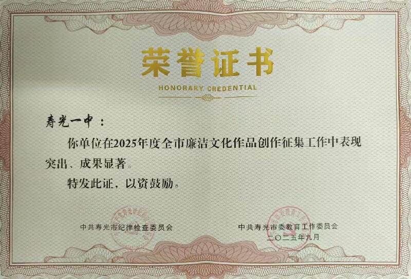 近日,寿光一中廉洁文化建设再传喜讯。学校提报的国画作品《莲花图》和书法作品《七律 清廉》均入选“潍润清风”廉洁文化书画展暨第二届“青未了”杯廉洁文化作品创作大赛参赛作品展,并被潍坊市廉洁文化建设中心收藏,学校因在作品创作征集工作中表现突出、成果显著获评“表现突出单位”。同时,学校提报的漫画作品《将军》作为寿光市廉洁主题优秀书画作品,在“清廉寿光·纪国之春”书画展和“菜乡廉韵·光影丹青”成果展进行陈列展示。