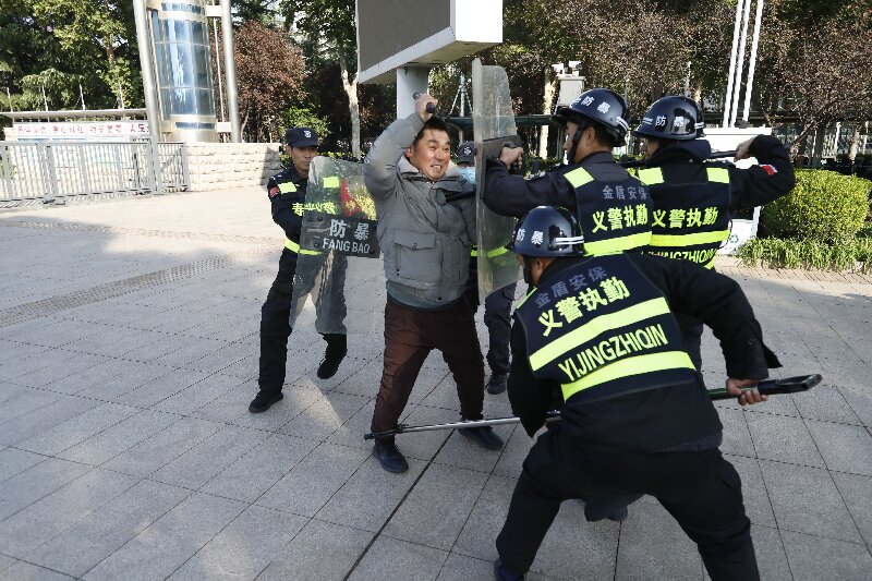 突击防暴演练正式开始,一名“歹徒”手持“凶器”意图持械闯进学校行凶,被校门口执勤保安及时发现。