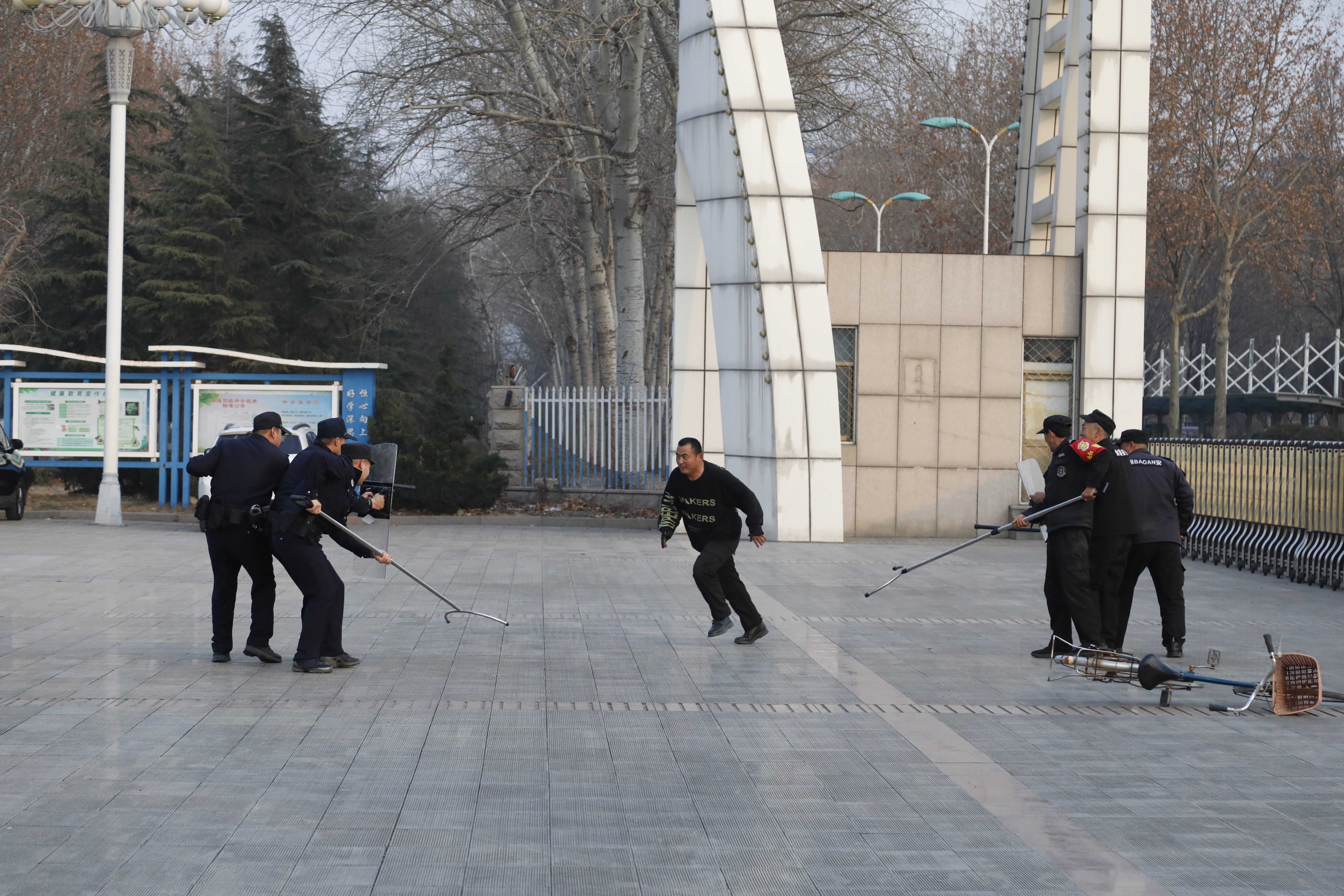 面对突发情况,学校保安人员在第一时间汇报学校、拨打报警电话并充分利用最小单元对讲机互通指令,同时手持盾牌、钢叉和长棍的保安队队员们立即对“歹徒”进行强制围堵,迅速启动“三对一”战术。