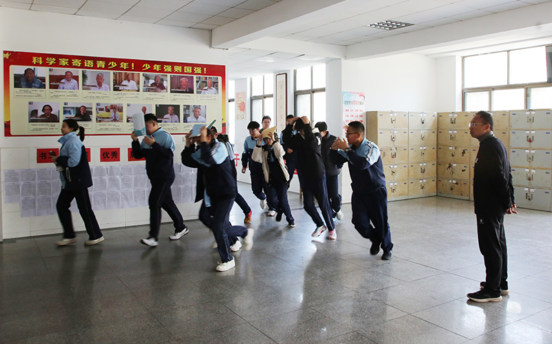 9点30分,警报响起,任课教师立即指挥学生紧急疏散,教师打开前门,同时命令后排靠门的同学打开后门,然后指挥学生按指定路线进行有序疏散。各班疏散到集合地点后,班主任清查班级人数并向级部主任汇总。演练中,学生们还模拟了在疏散时发生了意外及正确的处置方法。