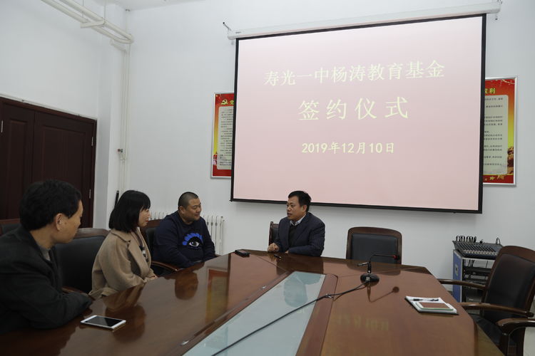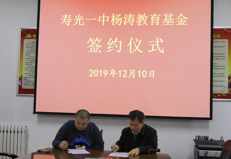 12月10日,校友杨涛来到寿光一中,与学校副校长梁本江签订了教育基金协议,向母校捐资20万元,成立“寿光一中杨涛教育基金”,奖励品学兼优、家庭困难的学生。而在此之前,杨涛校友就多次捐资助学,在2018年,向受灾一中学子捐款4万余元。