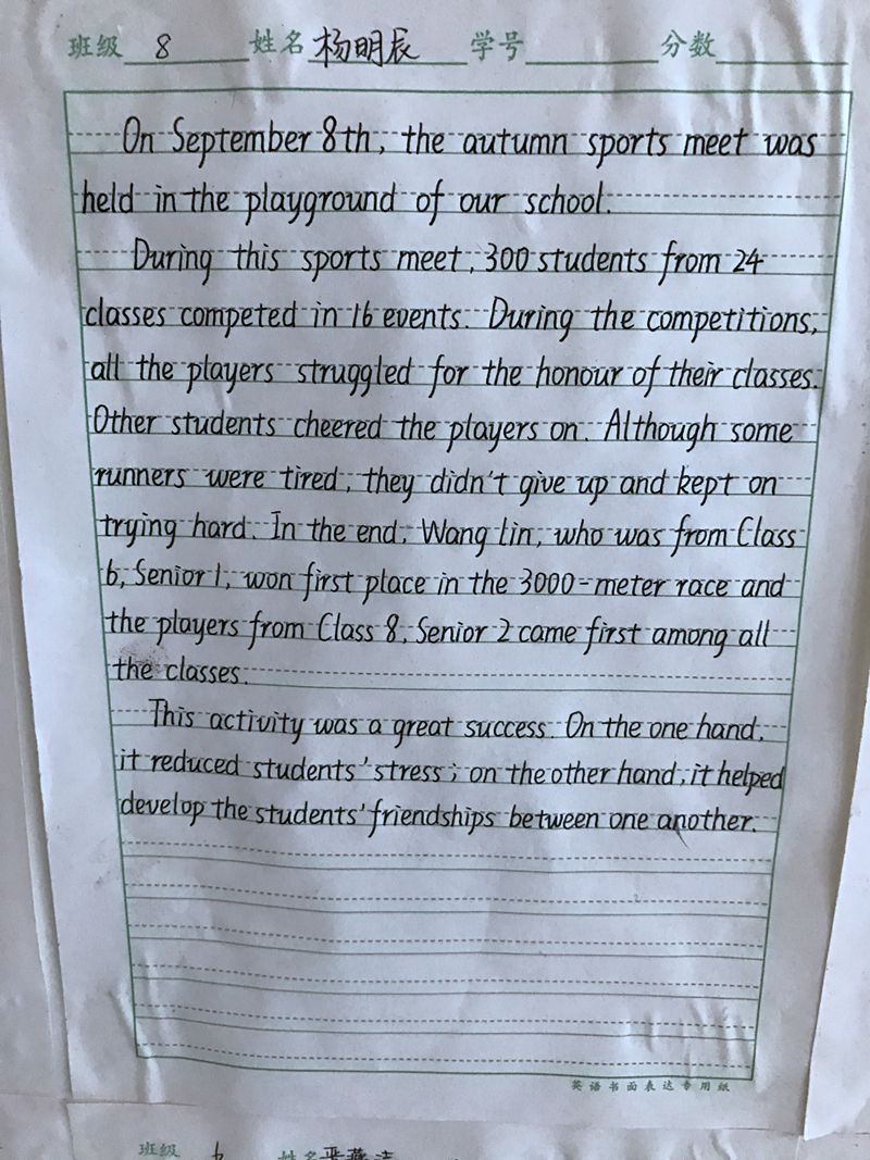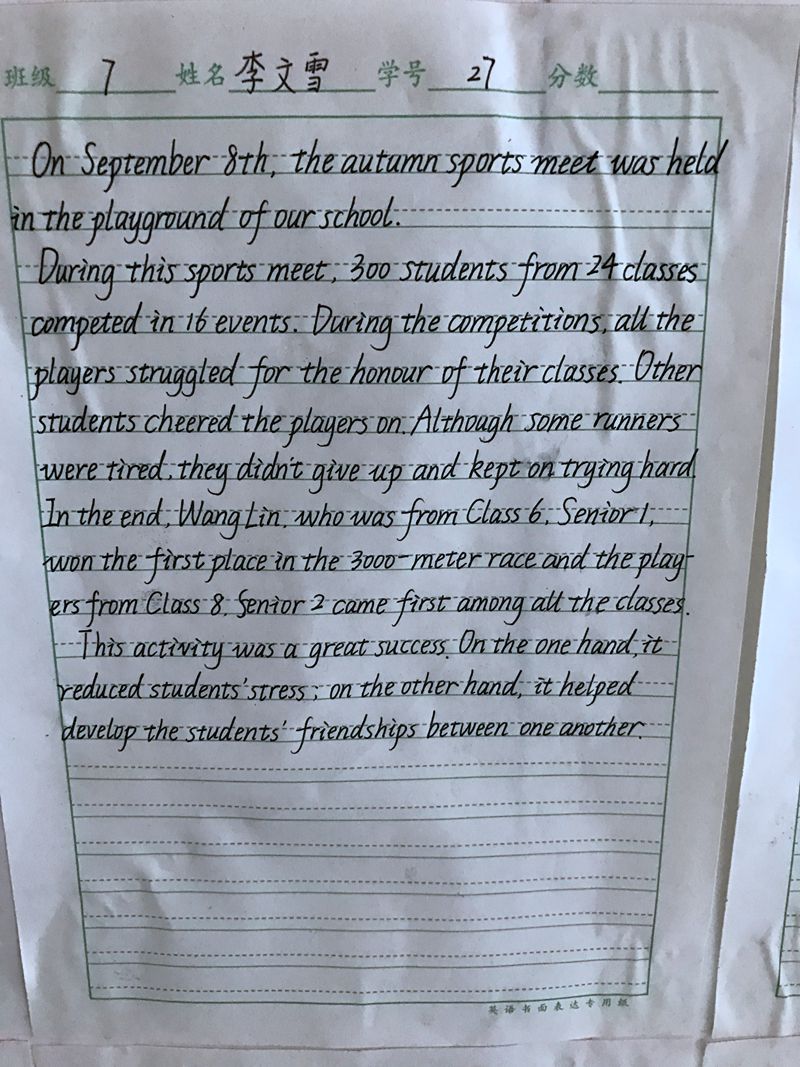 为帮助学生养成规范的书写习惯,激发学生学习英语的热情,打好高考书写坚实的基础,我校举行了英语书法比赛活动。